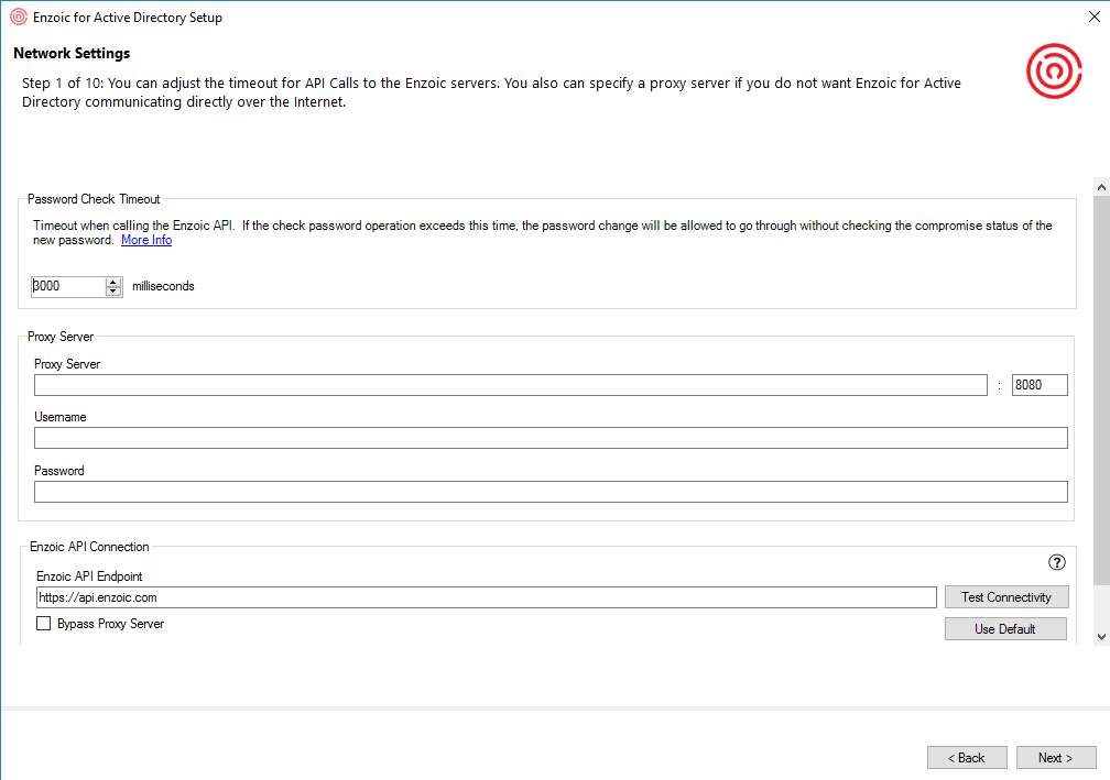 Enzoic is designed from the ground up with a security first mindset. While most security practices discourage open access between AD servers and the internet, many organizations utilize a proxy in order to restrict outside access to their AD environment. The Enzoic Proxy Settings are optional so you can skip them if it is not required by your organization. Enzoic will work with any HTTP proxy server. Please note, that because DC's may reside at different locations, the proxy settings are unique to every DC. Proxy Server Settings are the only settings that will not replicate across your AD environment and will need to be configured manually on each machine.